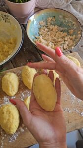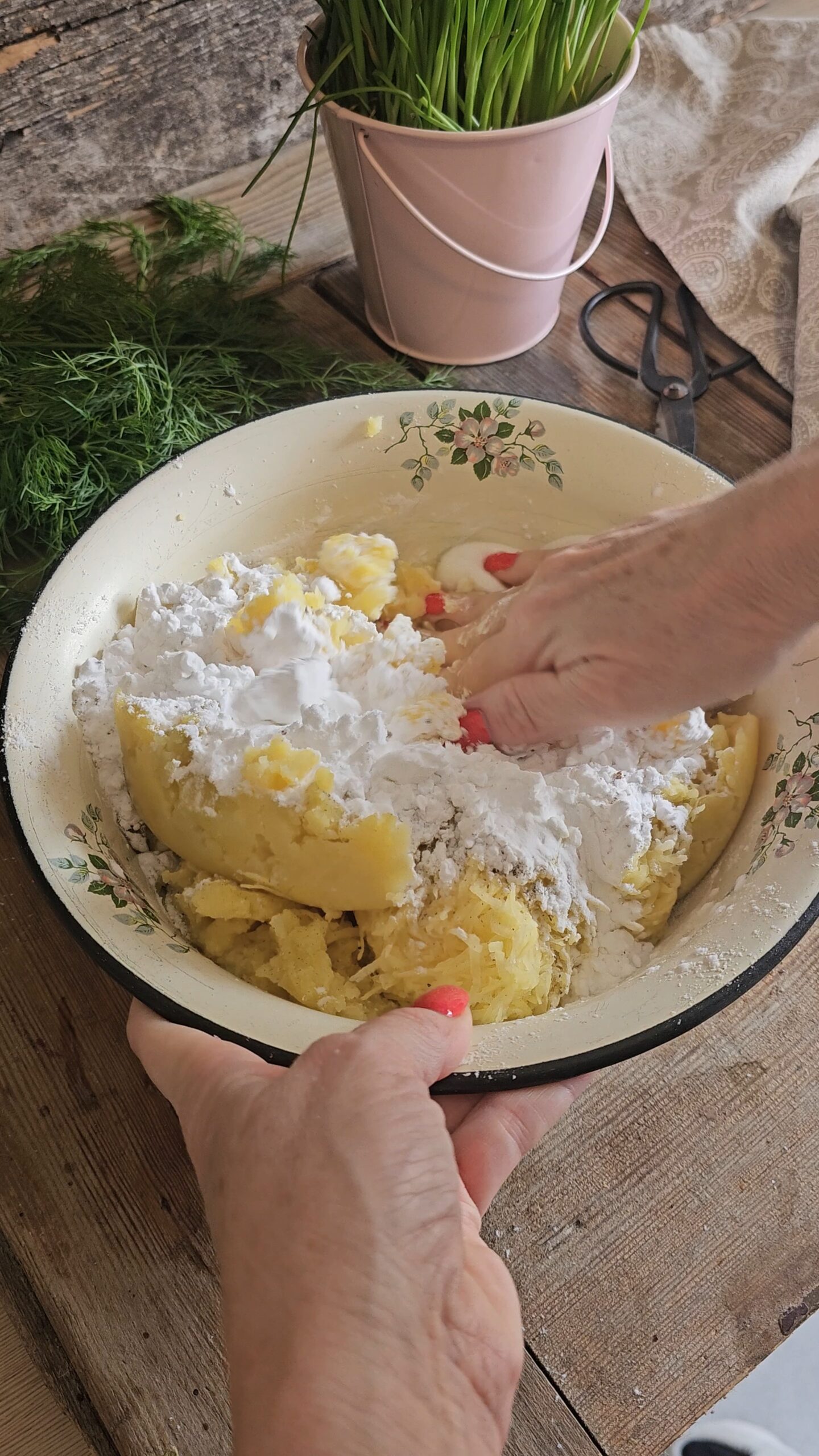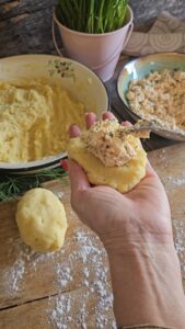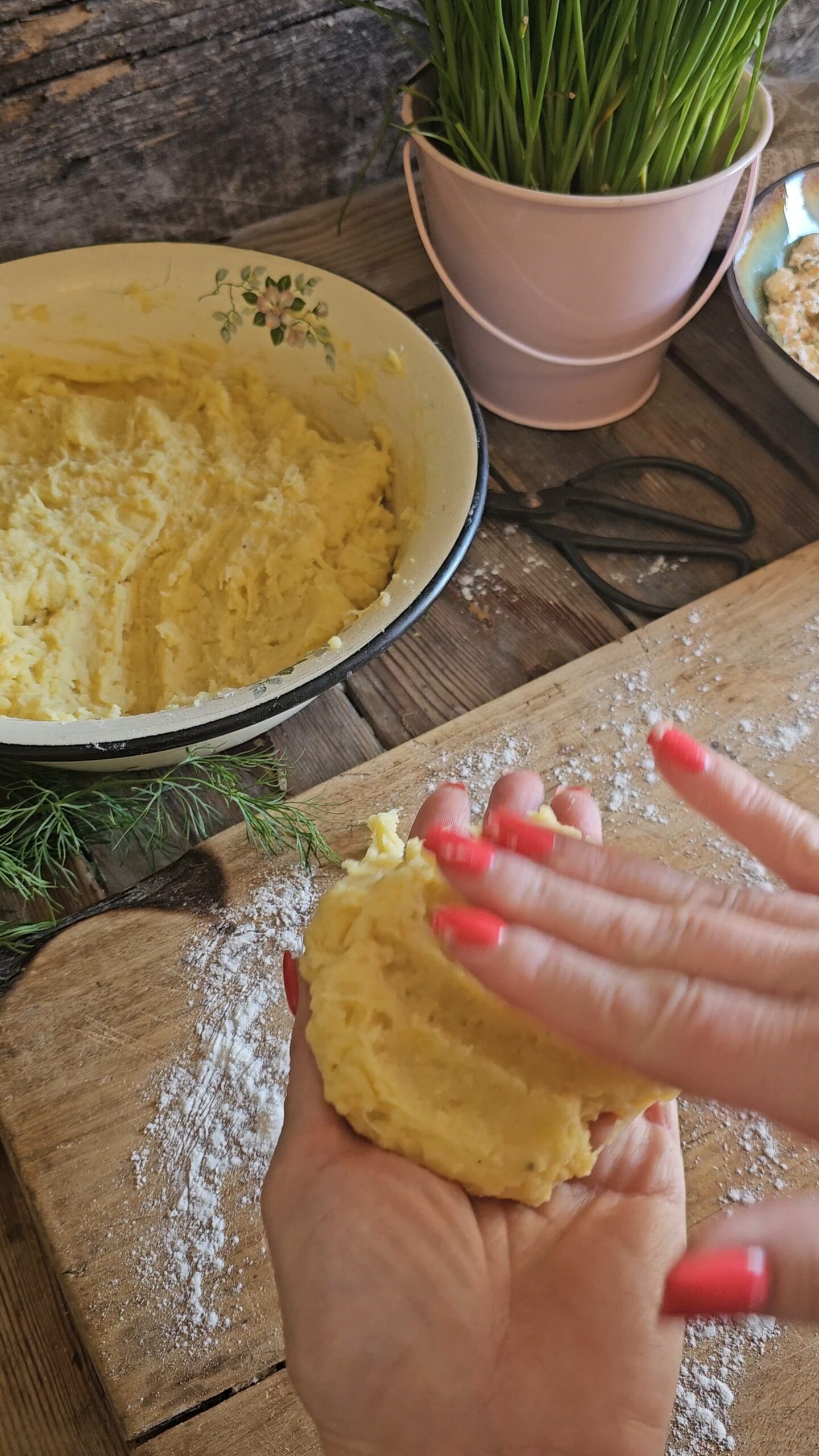 - 1 kg ugotowanych, potłuczonych lub przeciśniętych przez praskę ziemniaków (przestudzonych, waga przed ugotowaniem, 1 łyżkę odłożyć na później do farszu)