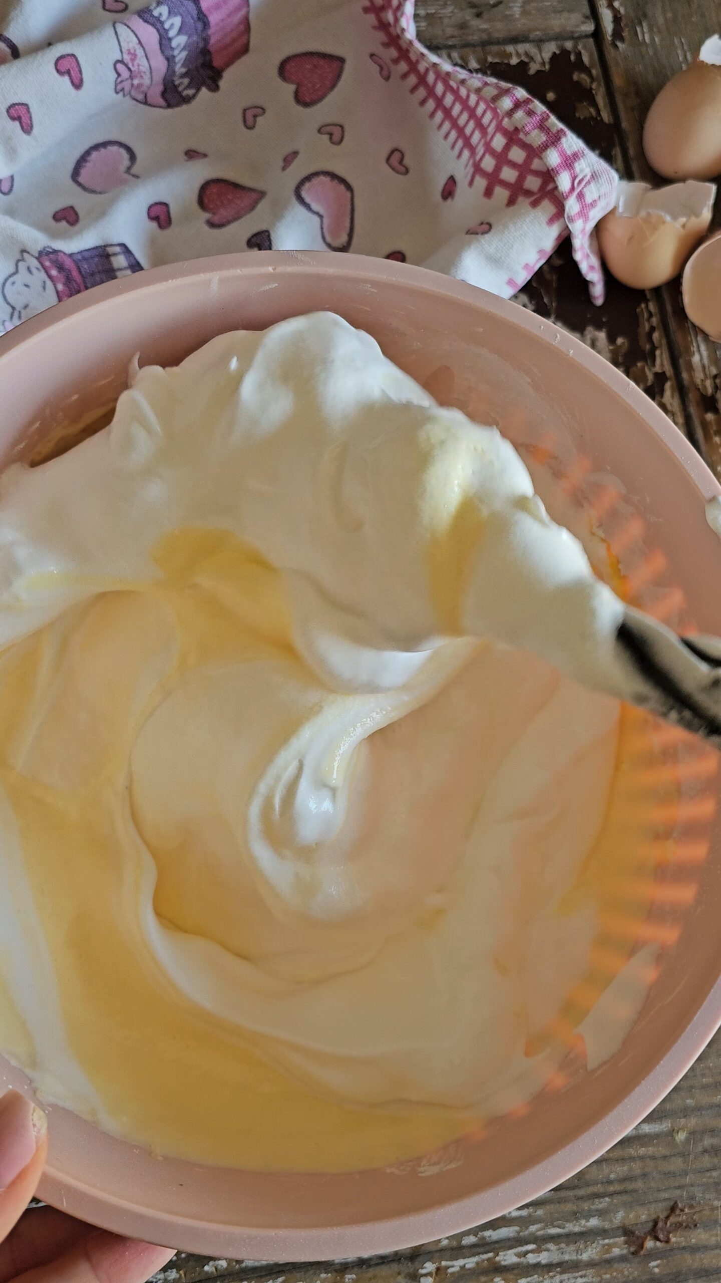 Wmieszać ją delikatnie do skyrowo- żółtkowej masy, a następnie przelać do przygotowanej formy.